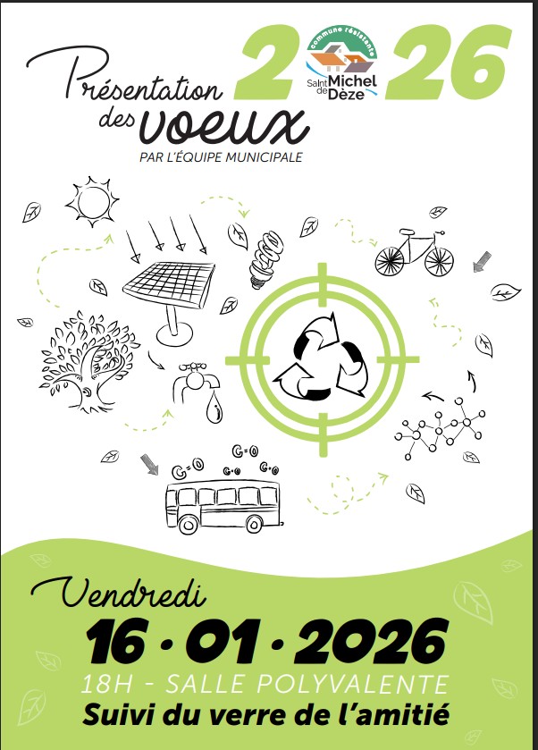 LES VOEUX DU MAIRE vendredi 16 janvier 2026 Publié le 8 janvier 2026 Venez nombreux à 18h00 salle polyvalente de St Michel de Dèze